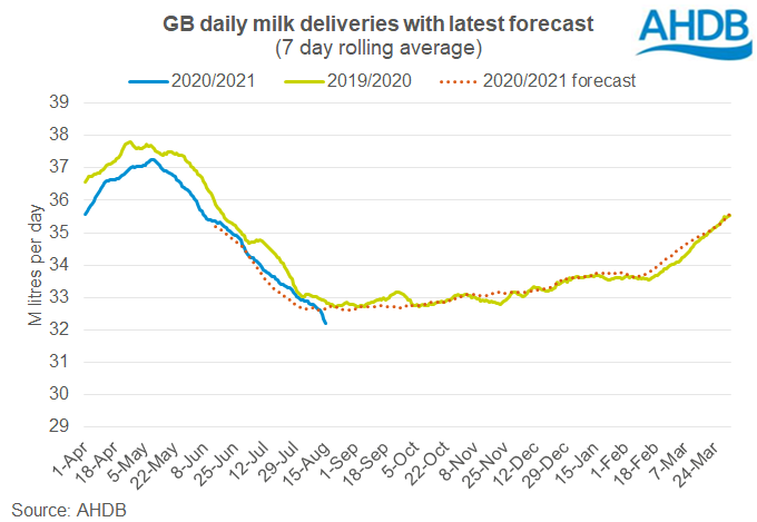 Milk deliveries dropped back considerably in the week ending 15th August, most likely as a result of the extreme heat, AHDB reports.