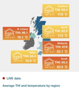 “The first two weeks of June illustrated the heat-stress conditions on many of our units, with maximum temperatures above 30°C recorded on consecutive days in the south. A maximum daily THI above 70 was recorded on 11 out of 14 days in the south and Midlands, and on a third of the days in the north and Wales during the first half of June.