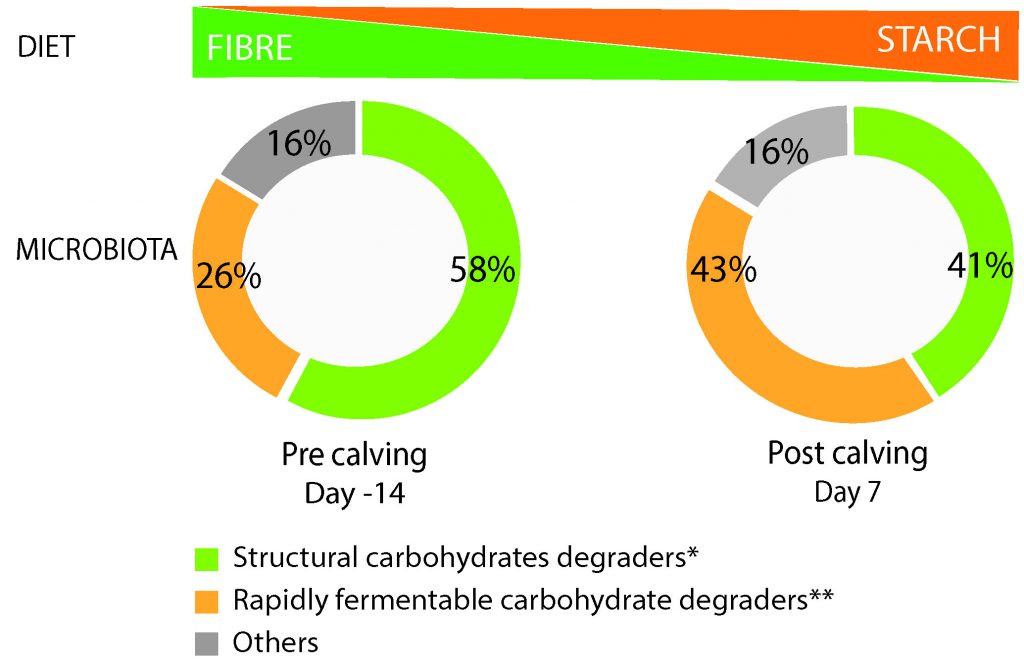 “This can be especially useful when transitioning from a high fibre dry cow diet to a high concentrate early lactation diet as it can help prepare the rumen microbiota for this substantial dietary change,” he notes.