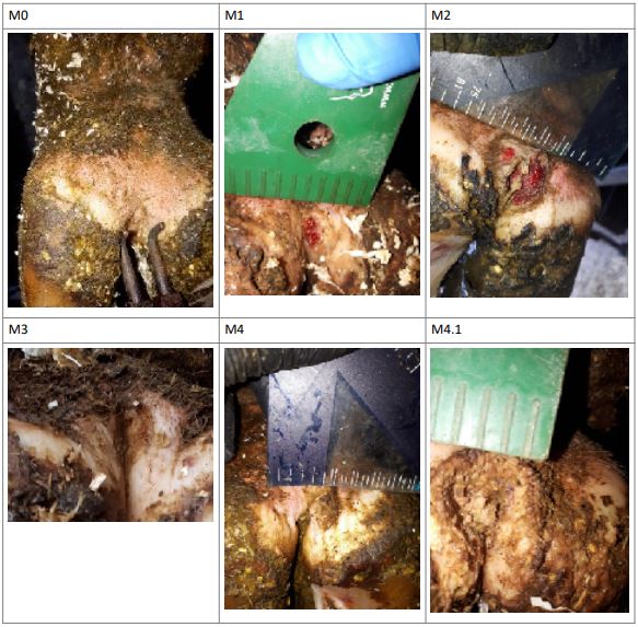 The M-Scoring system, see images, allows for the nature of the digital dermatitis problem to be monitored closely and to identify the nature of lesion regression and cure rates when ‘blitz’ treatments (three days of consecutive topical treatment for all animals with visible lesions, for example) are implemented.