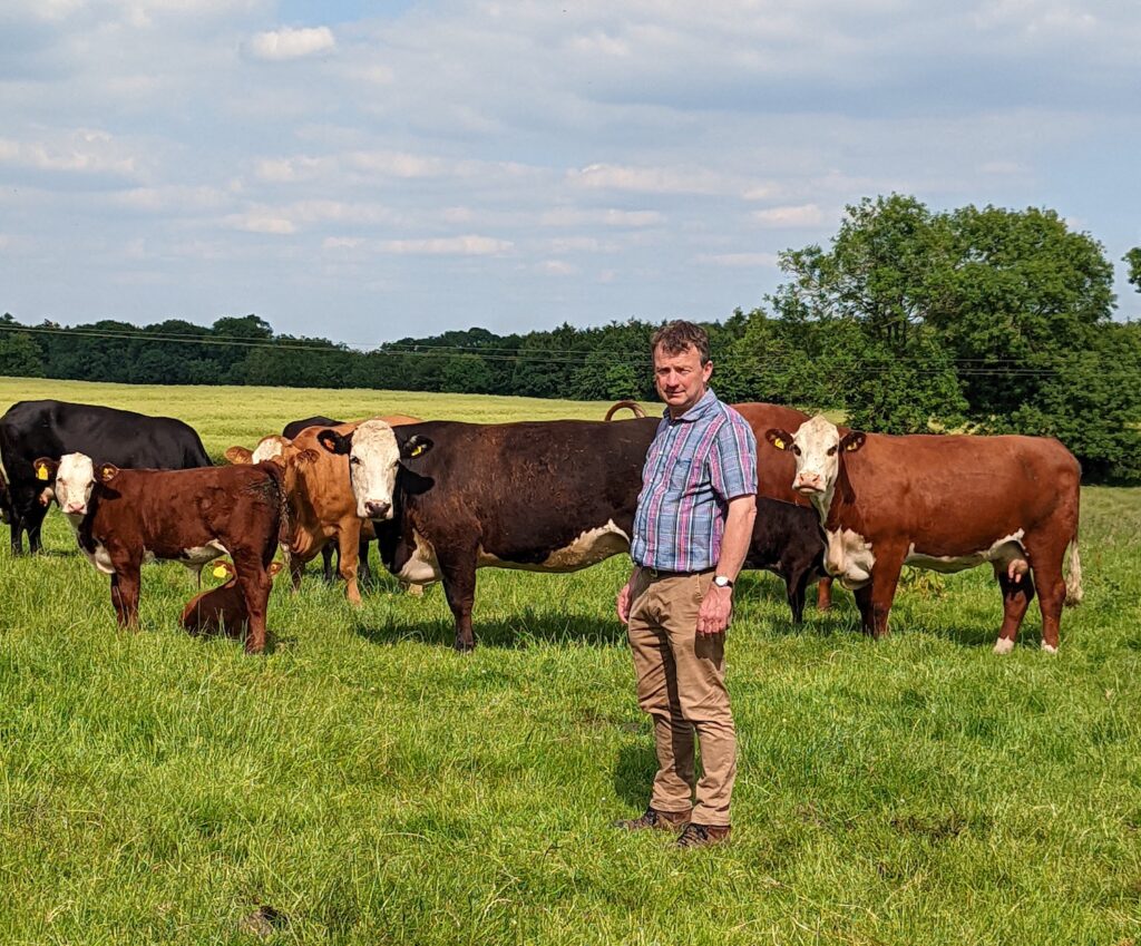 Mr Young keeps a herd of Red Poll cattle, which are mob grazed on herbal leys, including agroforestry land. Herd management decisions are made with both animal welfare and ecology in mind, which has meant working collaboratively with his vet to find the best approach to resolving disease challenges with neosporosis and leptospirosis.
