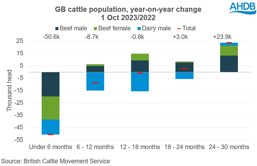 AHDB explained that a larger population of 12–30-month-old cattle at 1st October on paper would suggest supplies may be supported into the early months of 2024.