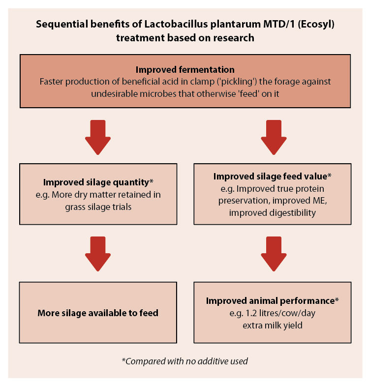 “If you look at the proven additive Ecosyl, for example, when applied, it provides 1 million specially-selected, beneficial Lactobacillus plantarum MTD/1 bacteria per gram of forage treated. Lactobacillus plantarum MTD/1 – or MTD/1 for short – is a highly-researched strain of bacteria, which is extremely efficient at fermentation. So it puts you in better control of the preservation process. Without this, you’re leaving fermentation at the mercy of whatever bacteria happen to be present on the grass – both good and bad bacteria. Which, in the current financial climate, is a big risk.”