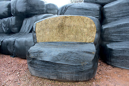 They produce 800 large square bales taken from three cuts per year, with a mix of perennial rye grass, white clover, lucerne and forage maize.