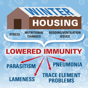 Animals indoors can be put under stress very easily, causing elevation in blood cortisone levels, which can trigger suppression of the immune system. Stressful changes in temperature, environment, housing and feeding can result in a depression of the immune system which coincides with an increase in the rapid spread of diseases, especially as the cattle will be in a confined space.