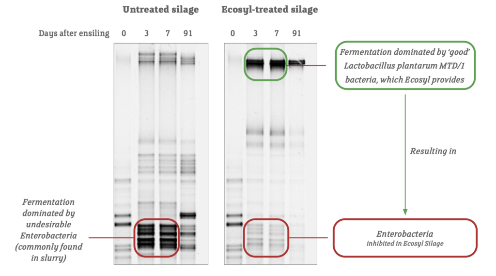 “Research on the additive, Ecosyl, has shown it to produce a very fast pH fall soon after ensiling, with DNA fingerprinting – a technique used in forensics – providing visible evidence of its effect. While untreated silage quickly became dominated by enterobacteria, there was very little growth of enterobacteria in the treated silage as the beneficial MTD/1 bacteria in Ecosyl dominated the fermentation.
