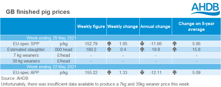The EU-spec APP also recorded an increase in the week ended 22 May, rising by 1.33p to 155.22p/kg. This is the highest price since early December and widened the gap between the APP and SPP to 3.48p.