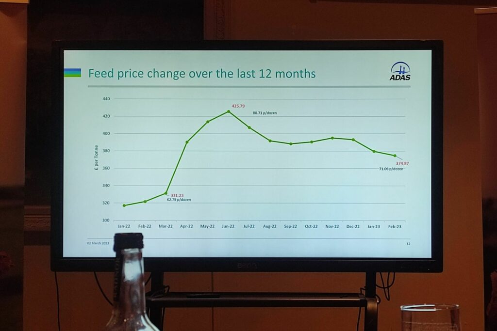 Meanwhile, feed prices stand at £369.73/tonne on the sheet, equivalent to £19.57/bird or 70.09p/doz in an average flock. In response to comments from the audience, Ms Monte clarified the prices are a mere snapshot of the time ADAS calculated them and not the real-time figures.