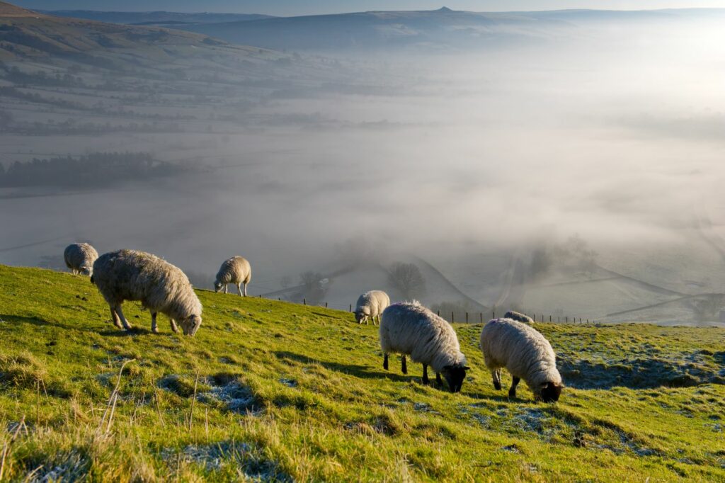 Sheep grazing in Peak District National Park, UK.