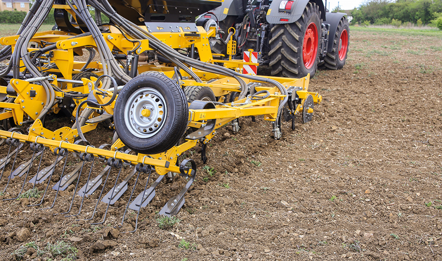 The seed hopper can be supplied for seed only or for seed and fertiliser and 50 per cent of the drill’s weight is carried on the hitch with the remainder on the drill’s wheels. The hopper and seeding chassis are separate so that regardless of hopper contents the seeding depth remains constant. Claydon standard seeding coulters follow the leading tines which zonally cultivate the soil behind the front cutting discs which cut through trash and help reduce soil disturbance.