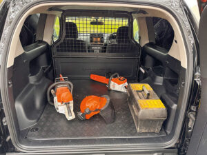 Behind the front seats is a substantial load retaining mesh barrier. The two rear side windows are blanked out, and the area usually used for rear seating is converted to a flat floor.