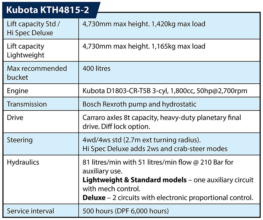 The Kubota KTH4815-2 comes standard with a 2-year, 2,000-hour manufacturer warranty. Extended warranties aren’t available currently but are likely to be an option in future. Back-up is available through Kubota’s large network of agricultural and groundcare specialist dealers, many of who offer attractive contract servicing packages. The base model has a recommended retail price of £53,378 while the Hi Spec Deluxe, like the machine tested, costs £65,623. All versions are available to order now, for delivery from late April, and Gordon Smith confirmed that Kubota’s target is to sell upwards of 100 units annually within less than three years.