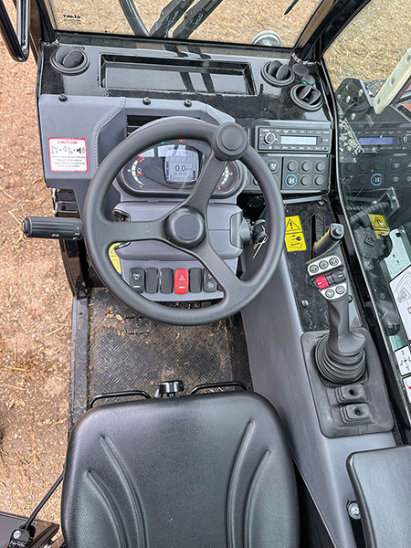 Hydrostatic drive is through a Bosch Rexroth hydraulic motor and there are two operating speed ranges – 0–7kph and 0–25kph. Permanent 4wd is standard, through 8t-rated Carraro axles linked by mechanical shafts. A front axle diff lock is available to maximise traction. Inboard, fully enclosed multidisc brakes are fully protected from dirt, and an external mechanical disc brake secures the machine when it is parked.