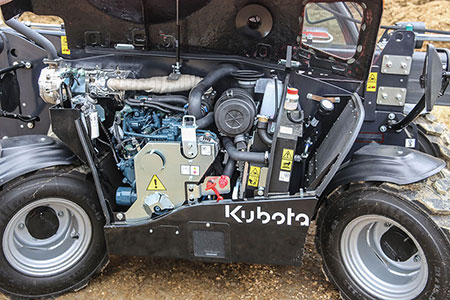 Power is from a Kubota D1803 1,800cc, 3cyl diesel engine meeting Stage 5 emissions standards and developing 50hp at 2,700rpm. Transversely mounted, the compact engine is easy to service, with superb access for cleaning, and for checking and changing lubricants and filters. Kubota product manager – construction, Gordon Smith explained that a DOC and DPF are used to control emissions, and the DPF has a service interval of 6,000 hours. Regeneration frequency is reduced compared to Kubota’s earlier systems and can take place at much lower revs.