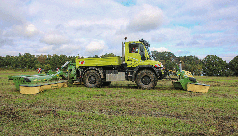 With front and rear linkage, this 300hp Unimog U530 had no problem handling a set of Krone triple mower-conditioners