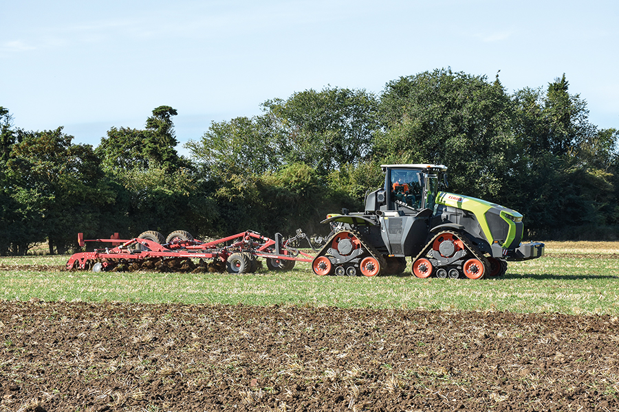 The obvious difference between this machine and any other Claas Terra Trac model is the triangular track drive system. These have been designed specifically to put large amounts of power to the ground and to pull big cultivators, and are unique in the Claas line-up to these two new models.