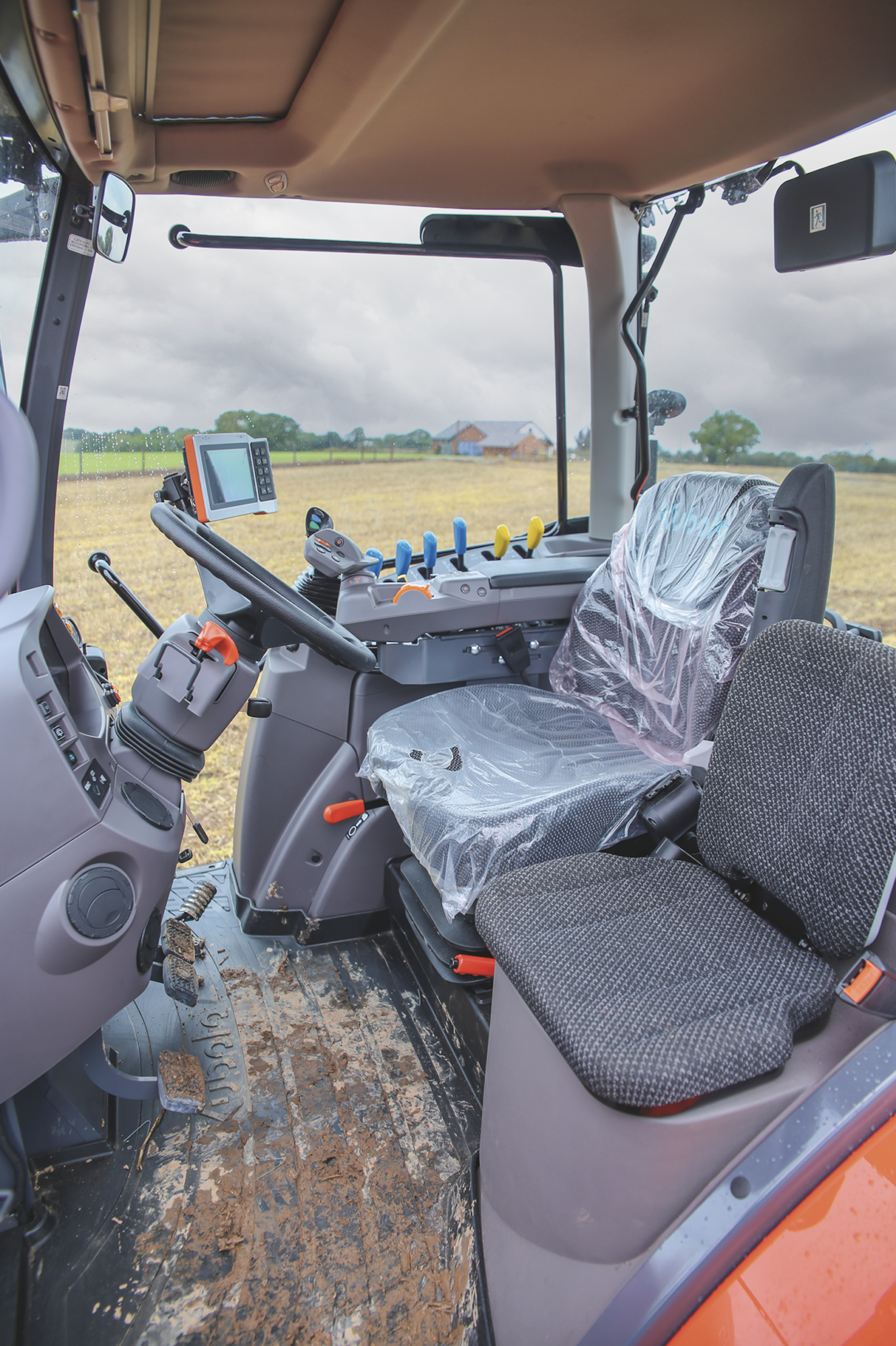 The four-post cab frame is shared with the larger M7-series and the MG-X, but the interior finish is different. Cab and front axle suspension and a Grammer seat are standard for the UK market. Armrest-mounted controls include a multi-function joystick with buttons to shuttle between forward and reverse, operate the hydraulic linkage and to store and select travel and engine speeds. Travel direction can also be selected using the main shuttle lever beside the steering column.