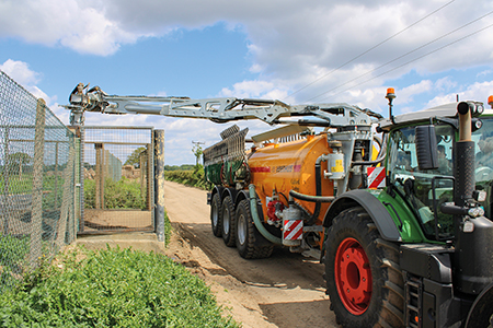 The farm uses different types of slurry and has different requirements for application density, Oliver explained: “This machine will spread down to around five tonnes per hectare, but we typically deliver in the region of 15–20 tonnes per hectare. Typical digestate analysis is around 3.5–4.5kg per tonne, so we deliver around 90kg per 20 tonne load, of which 80% is available to the crop. We can also use food waste, which allows us to run up to 250 tonnes per hectare when required. We store our own slurry on site which is typically produced from food waste and digestate.