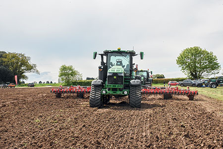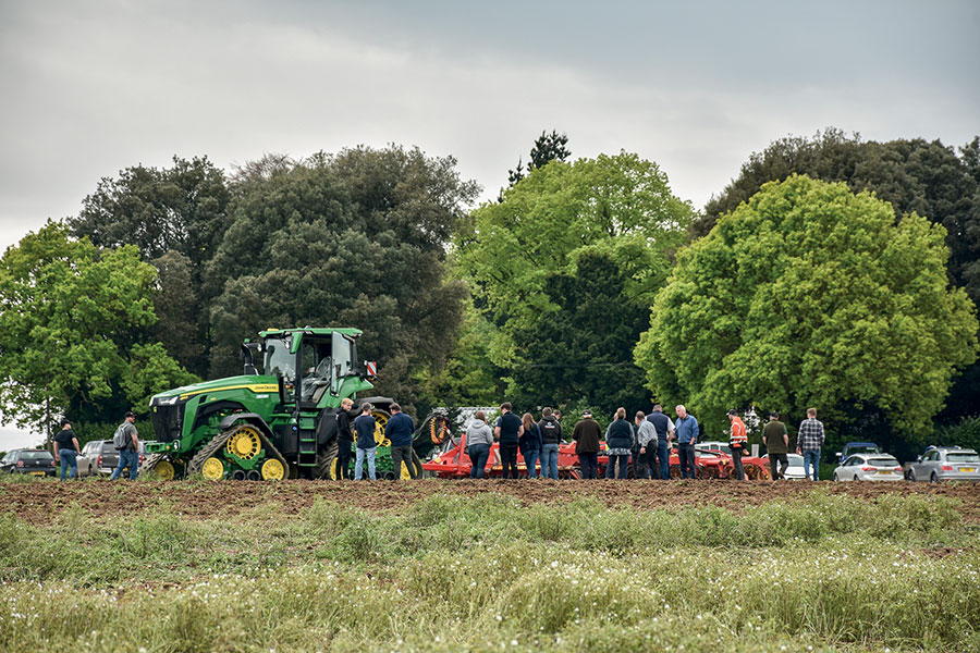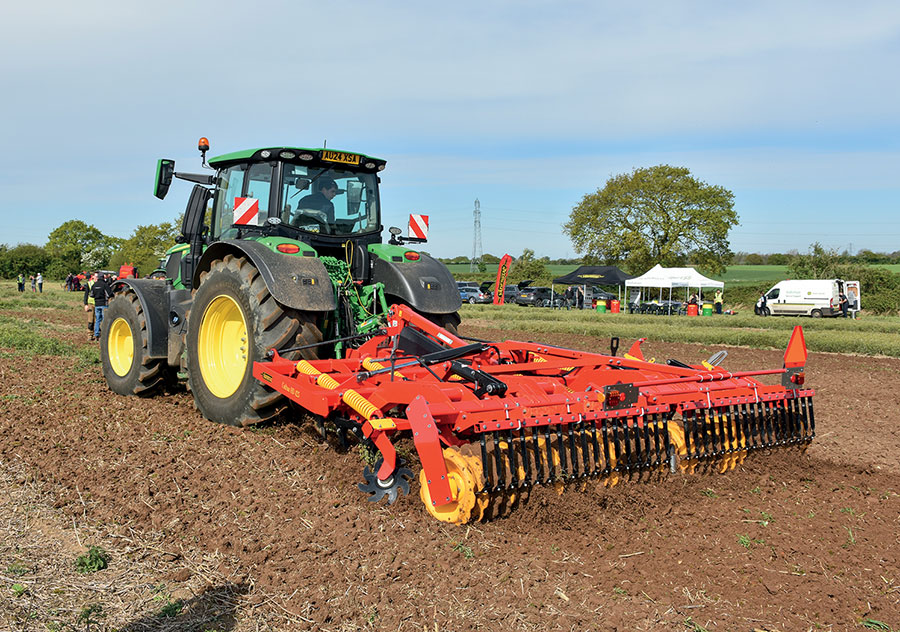 At the top of the field, the 12.4m NZ Extreme – one of the biggest cultivators available – was put to work, pulled by a John Deere 8RX, while a Cultis HD425 cultivator performed well in the damp soil.