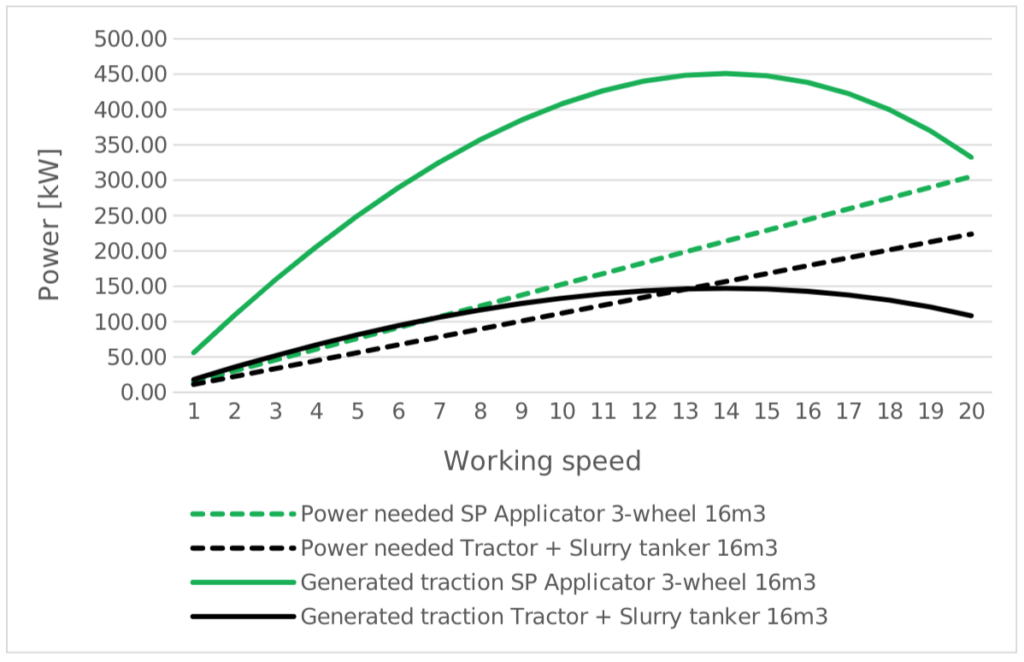 The graph shows the difference between carrying and towing the weight of slurry. Most interesting is the curved line, which represents the maximum traction that can be generated, based on the wheel load and tyre specifications. The self-propelled slurry applicator is carrying all the weight on driven wheels, and is therefore always able to generate enough traction to propel the machine. As the curve shows, there is even plenty of traction available to pull an implement such as a disc cultivator to preserve nutrients in the soil.