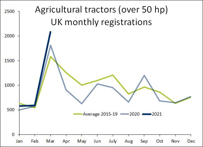 The upturn in agricultural tractor registrations (over 50hp) seen in recent months continued into March, normally the peak month for registrations each year. The monthly total of 2,085 machines was 15% higher than in March 2020. Indeed, it was the highest monthly total for any month since March 2012 (and the first time over 2,000 machines have been registered in a single month in that time). That brings the total for the year to date to 3,259 registrations, 13% more than in the opening quarter of 2020.