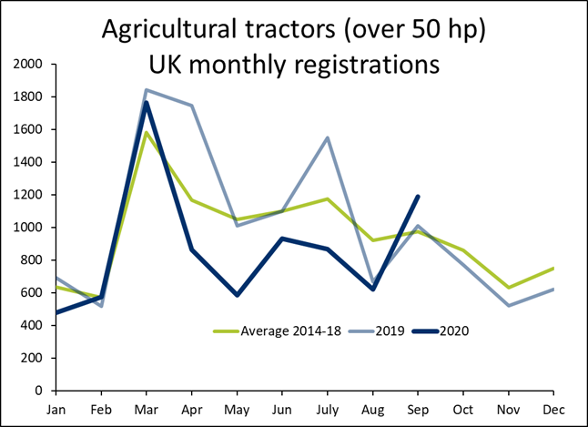 Registrations of agricultural tractors (over 50hp) returned to year-on-year growth in September, for the first time since February and only the second time in 12 months. The monthly total of 1,187 machines, was 18% up on the same month last year. Some of this may be due to manufacturers working through a backlog of orders which built up while factories were closed earlier in the year. However, there have been signs that the machinery market has picked up over the summer, so much of the increase will be due to these improving conditions. The total for the year to date is now up to 7,870, 22% behind the same point in 2019.