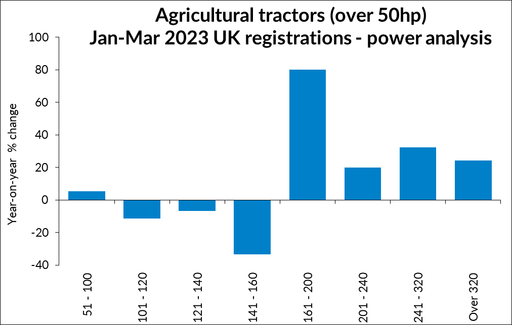 Registrations of machines over 200hp were also up by more than 20% on the previous year. However, fewer tractors were sold under 160hp in the opening three months of 2023.
