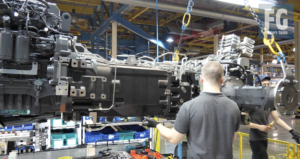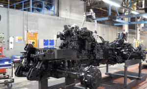 Hydraulic pipes, axles and other parts are added as it travels along the production line. The chassis never stops moving, so everything is attached as it passes through each area.