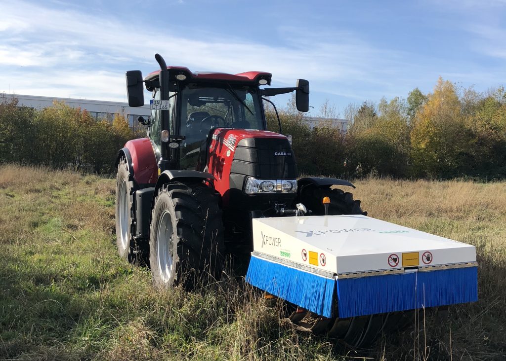 “Mounted on a tractor or its implement at a working width of 1.2-3.0m, its weed contact unit(s) create a high voltage. With the aid of a sensor and/or camera-based guidance system, XPower, controlled by the tractor’s Class 3 ISOBUS system, transfers this voltage via one element on contact with the weed leaves which stand proud of the crop or ground, whereupon it travels down to the roots. Another element touching another weed closes the electrical circuit and the weed chlorophyll is damaged immediately. The system is as effective on larger weeds as smaller ones.