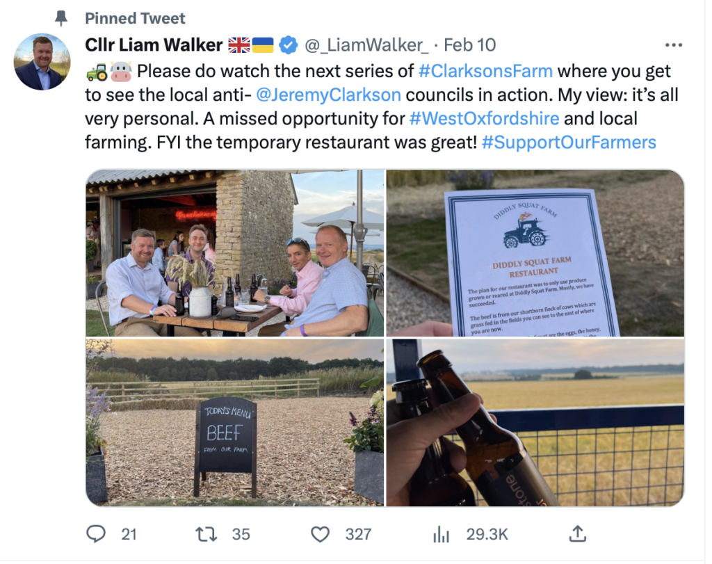 On Twitter, Oxfordshire County Councillor Liam Walker called WODC’s decision a ‘missed opportunity’ for the county and local farming, adding that in his view ‘it’s all very personal’. Similarly, Welsh farmer Gareth Wyn Jones said it’s a ‘pity the council aren’t supporting @JeremyClarkson […] supporting rural business backing British agriculture’.