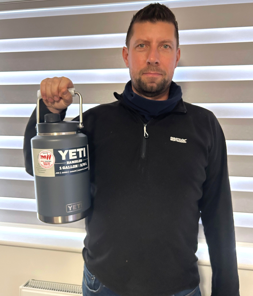 Toby Chambers from Cambridgeshire said it made his day to come home to his prize – a Yeti Rambler 1-gallon cup donated by Thurlow Nunn Standen.