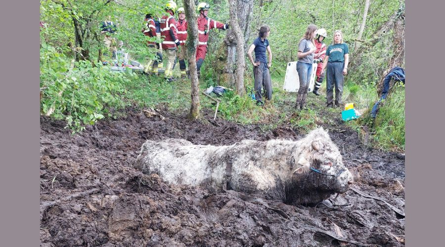 A number of crews responded to assist Bruce, a nine-year-old stock bull, weighing approximately 800kg, who had become stuck up to his chest in a bog.