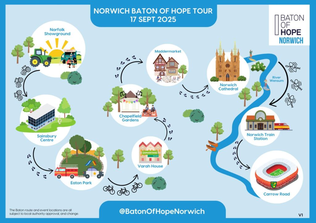 Jane Brown, director of Norwich Samaritans, said: “We’re honoured to host the Baton of Hope and help shine a light on such an important issue. Every suicide leaves families, friends, and communities shattered by the loss. We believe this will be a landmark moment for mental health awareness in Norwich.