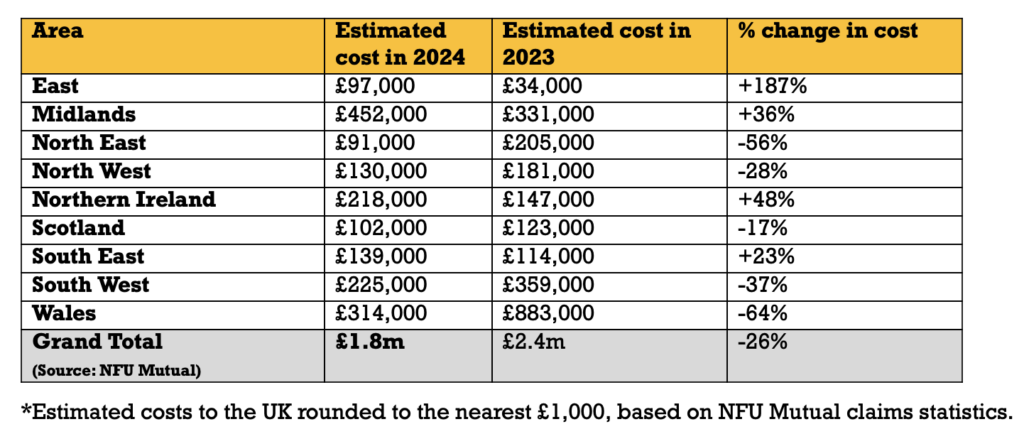 Hannah Binns, NFU Mutual’s rural affairs specialist, said: “It is encouraging to see the estimated cost of livestock worrying fall in 2024, following NFU Mutual campaigning alongside industry efforts to increase awareness among dog owners.