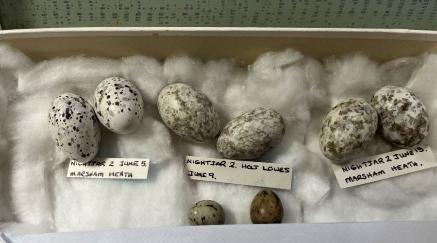 A further collection of eggs, which looked much newer, was found behind the bath panel, including a box containing a pair of nightjar eggs with the label ‘Nightjar 2, Holt Lowes June 9.’