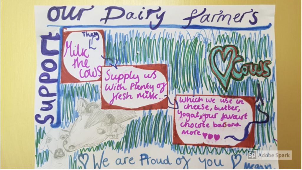 The primary students ranging from 8-11 years of age then had to produce a poster highlighting what they had learned about the problems in the dairy industry and how they can generate support.