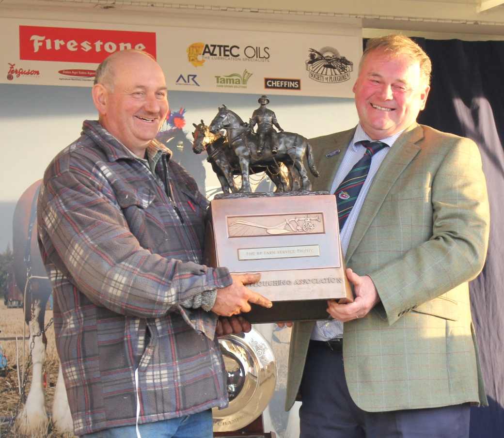 Jim Elliott, Horse Ploughing Champion receiving his trophy from Society of Ploughmen President, Ian Harvey.
