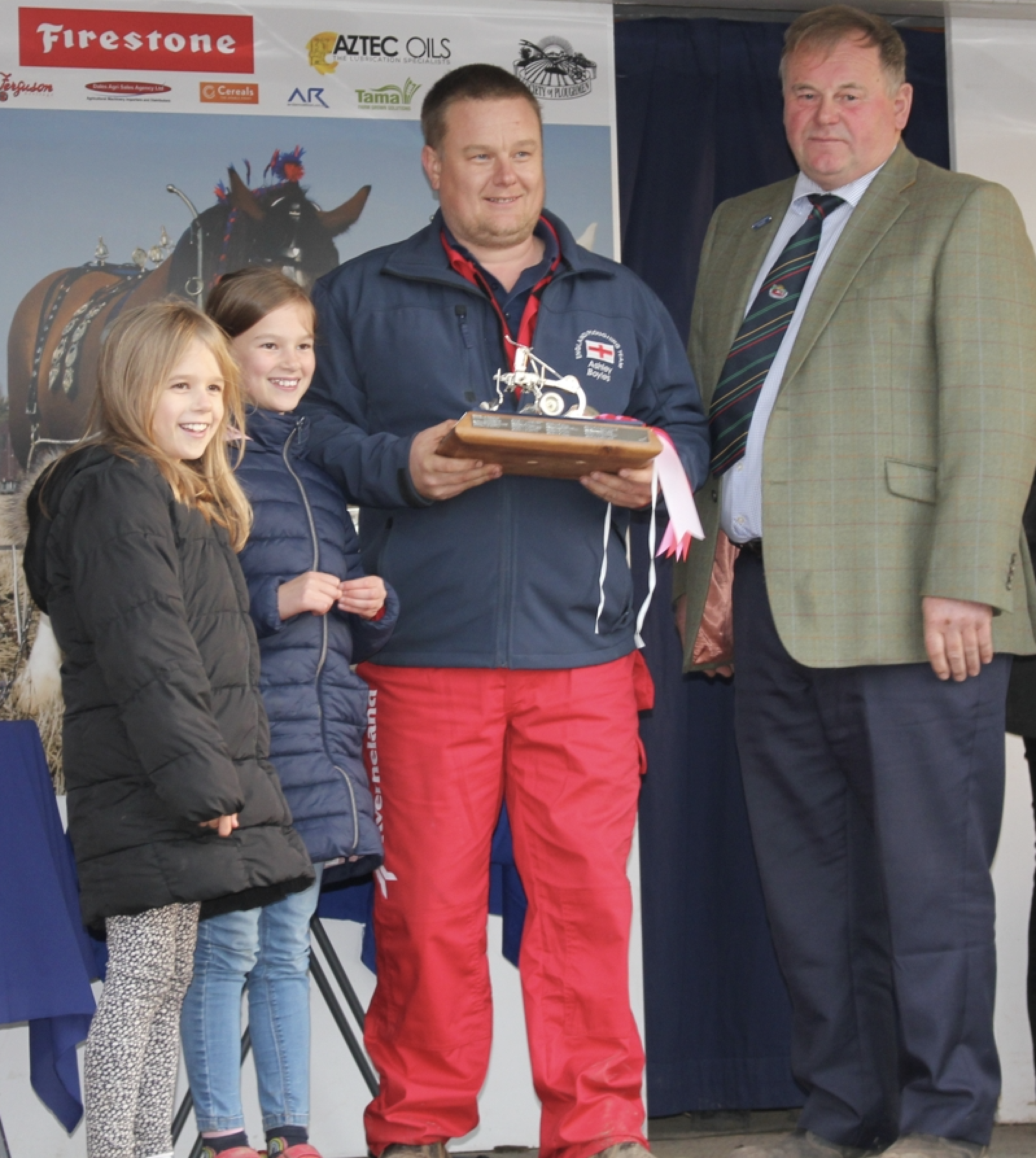 Ashley Boyles, winner of the Conventional Final Plough-Off with his daughters Pippa and Megan, receiving his trophy from the host farmer and President of the Society of Ploughmen, Ian Harvey.
