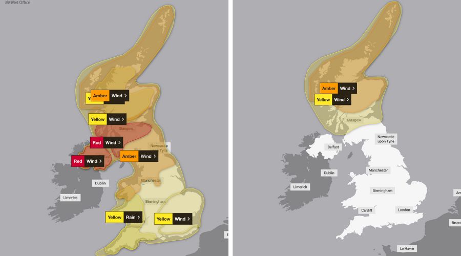 But the strongest winds and most significant impacts are likely to be in Northern Ireland and central and southwestern parts of Scotland within the red warning areas.