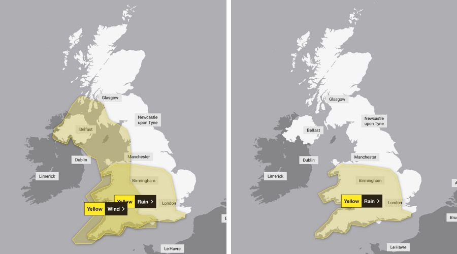 - Yellow warning for rain from 00:00 until 09:00 in the southwest of England on Friday.