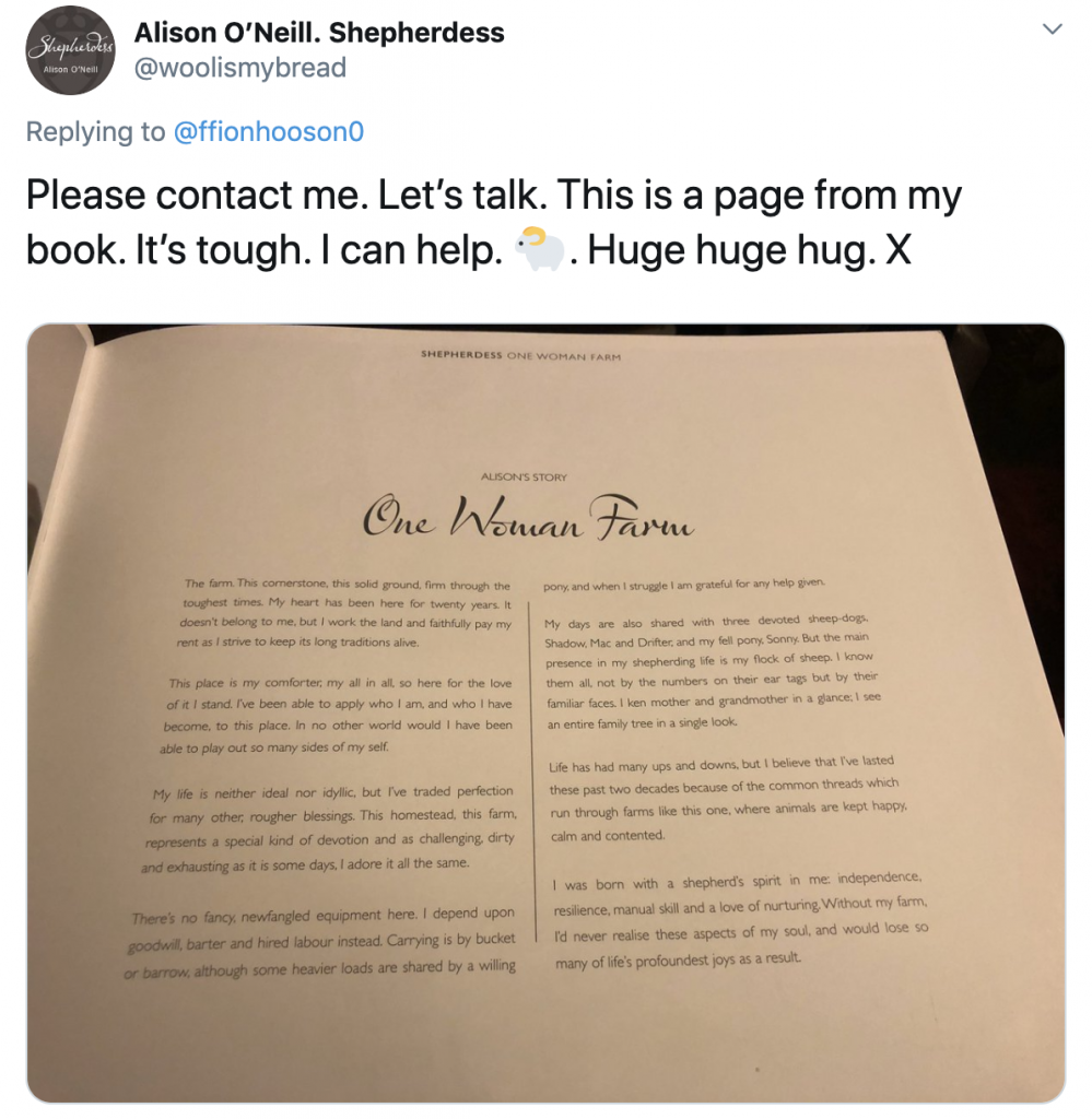 The tweet quickly gained over 2,000 retweets and almost 25,000 likes, sparking an online debate about mental health, with many fellow farmers offering their advice and attention. One said, “You are not alone. I hope you see people from all over the world are pulling for you. And that is something very special.” Yorkshire Shepherdess and entrepreneur, Alison O’Neill, directed Ffion to a page in her book ‘One Woman Farm’ to highlight the similarities in their situations – ‘This homestead, this farm represents a special kind of devotion and as challenging, dirty and exhausting as it is some days, I adore it all the same,’ she writes.