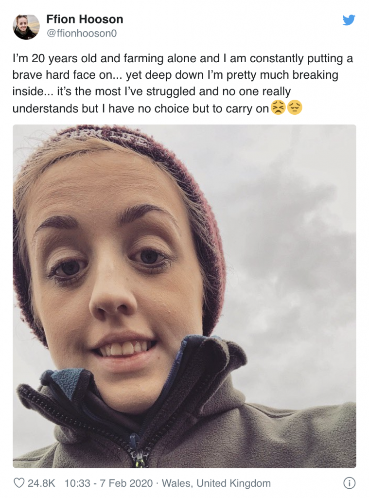 ‘I’m 20 years old and farming alone and I am constantly putting a brave hard face on… yet deep down I’m pretty much breaking inside… it’s the most I’ve struggled and no one really understands but I have no choice but to carry on.’